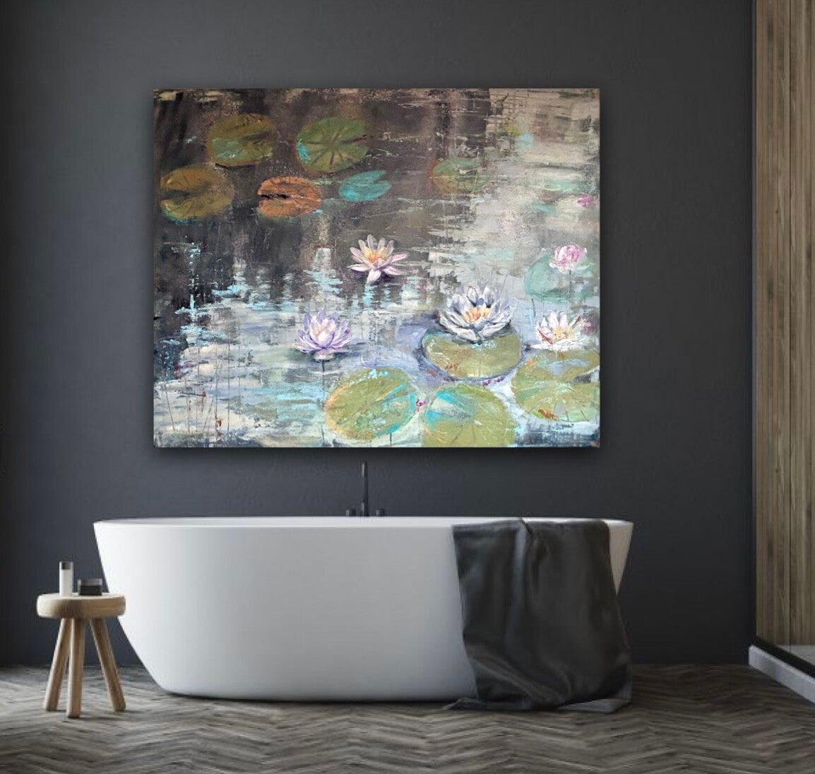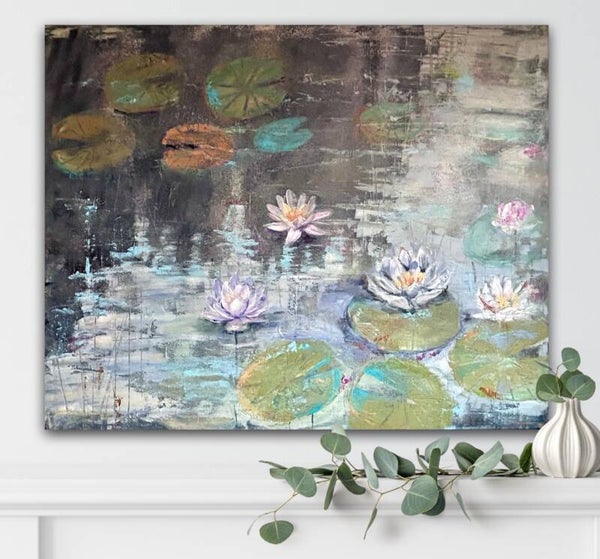 Akryl på lerret, kantene er ca 2 cm dype og malt sorte. Et stemningsfullt bilde med en balansert blanding av kalde og varme farger og røffe penselstrøk.