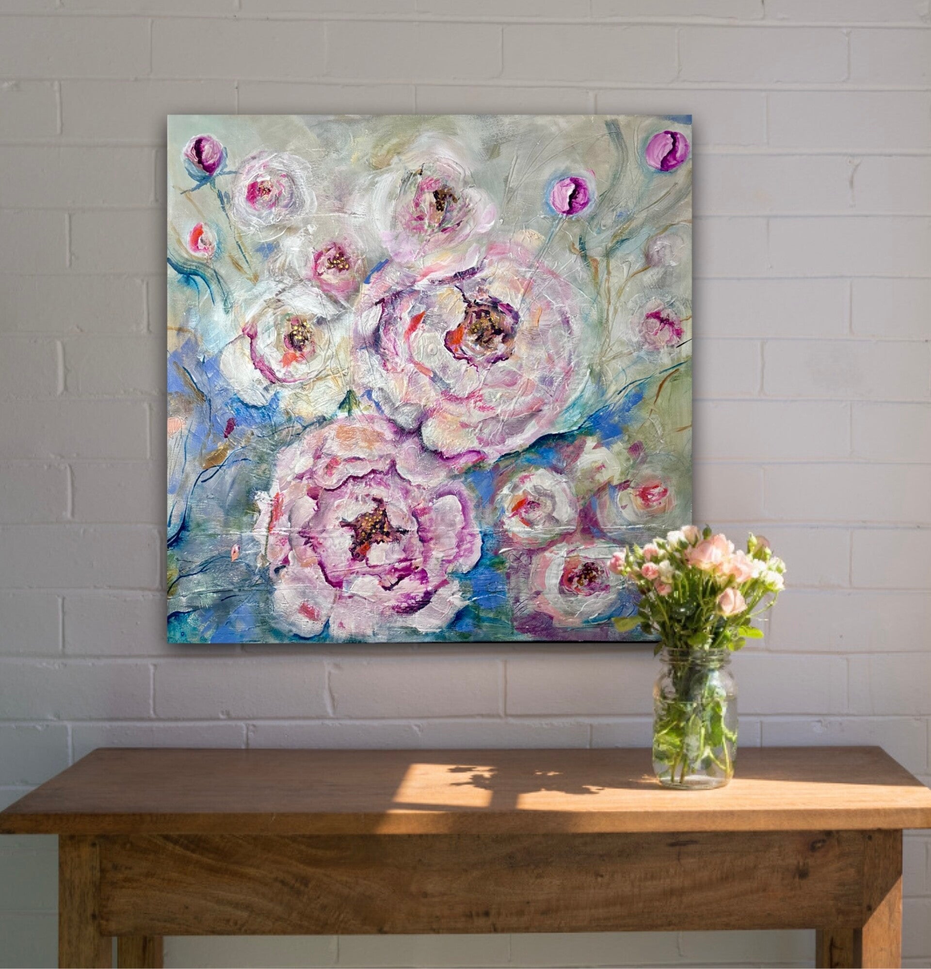 Akryl på "deep edge" lerret, kantene er ca 4 cm dype og malt sorte. Et bilde fullt av Peoner og sommerlykke, et maleri til å bli glad av.